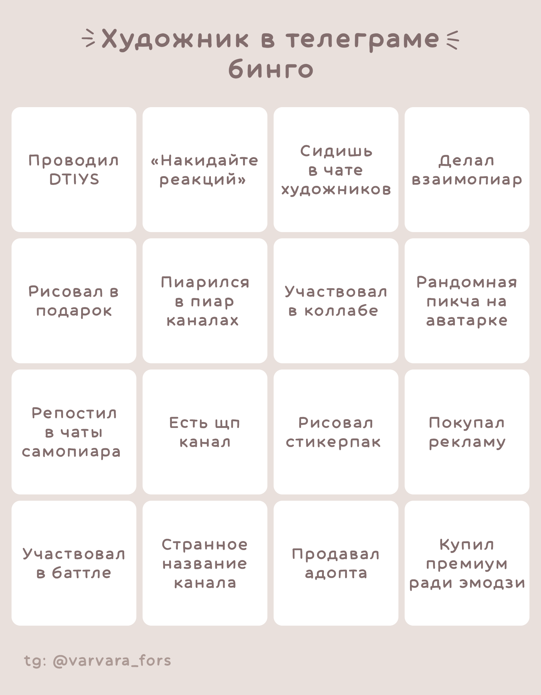 - Не стесняйтесь ставить вотермарки или прямо на арте писать ссылку на телеграм канал. Я однажды наблюдала, как человек набрал 2к подписчиков благодаря своим бинго, на котором была ссылка на тгк